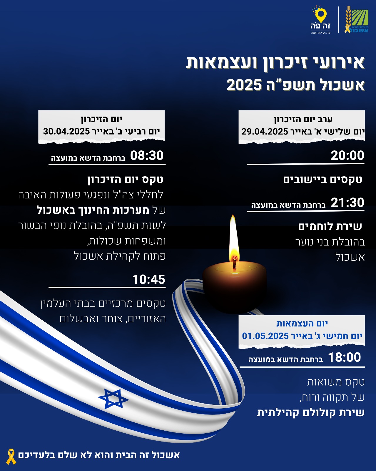 - בערב יום הזיכרון, יום שלישי 29.4 יתקיימו טקסים ביישובים. לאחריהם, הציבור מוזמן להתכנס יחד ברחבת הדשא במועצה לשירת לוחמים בהובלת בני הנוער של אשכול.
