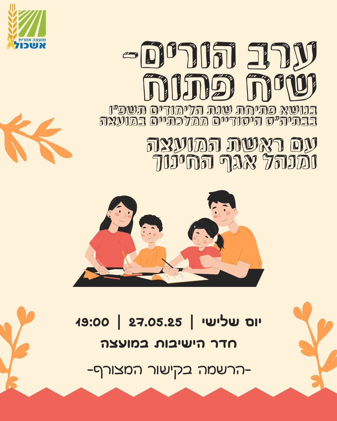 בשבוע הבא נקיים ערב הורים - שיח פתוח בנושא פתיחת שנת הלימודים הבאה (תשפ"ו) בבתיה"ס היסודיים ממלכתיים, בהשתתפות ראשת המועצה מיכל עוזיהו ומנהל אגף חינוך עמיחי הס.