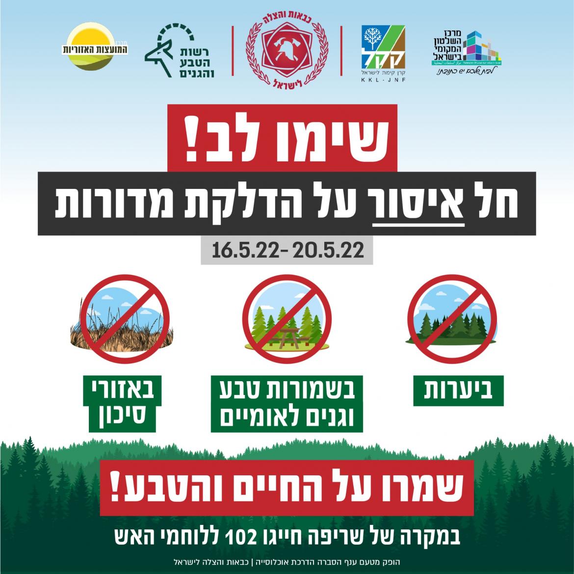 על פי צו נציבות כבאות והצלה חל איסור על הדלקת מדורות בשטחים פתוחים- ביערות, שמורות טבע ואזורי סיכון, למעט במקומות שהוכשרו וקיבלו אישור מהרשות ונציבות כבאות לישראל.