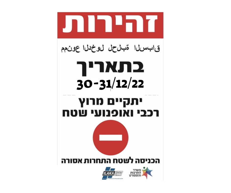 בתאריכים 30-31.12.22 מתקיים ראלי רייד באזור אשלים, חולות חלוצה. הכניסה לאזור זה מסוכנת ואסורה.