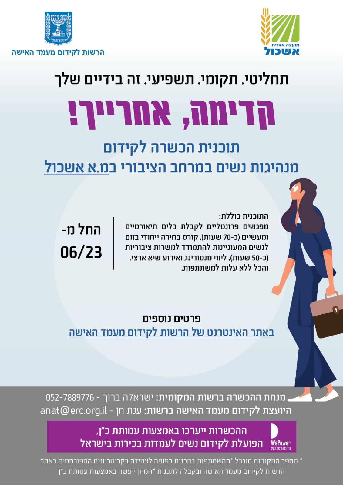 קורס יחודי של הרשות לקידום מעמד האישה לעידוד, הכשרה ושילוב נשים בזירה הציבורית: במליאת המועצה, בהנהגות היישובים ובוועדי הנהלה.