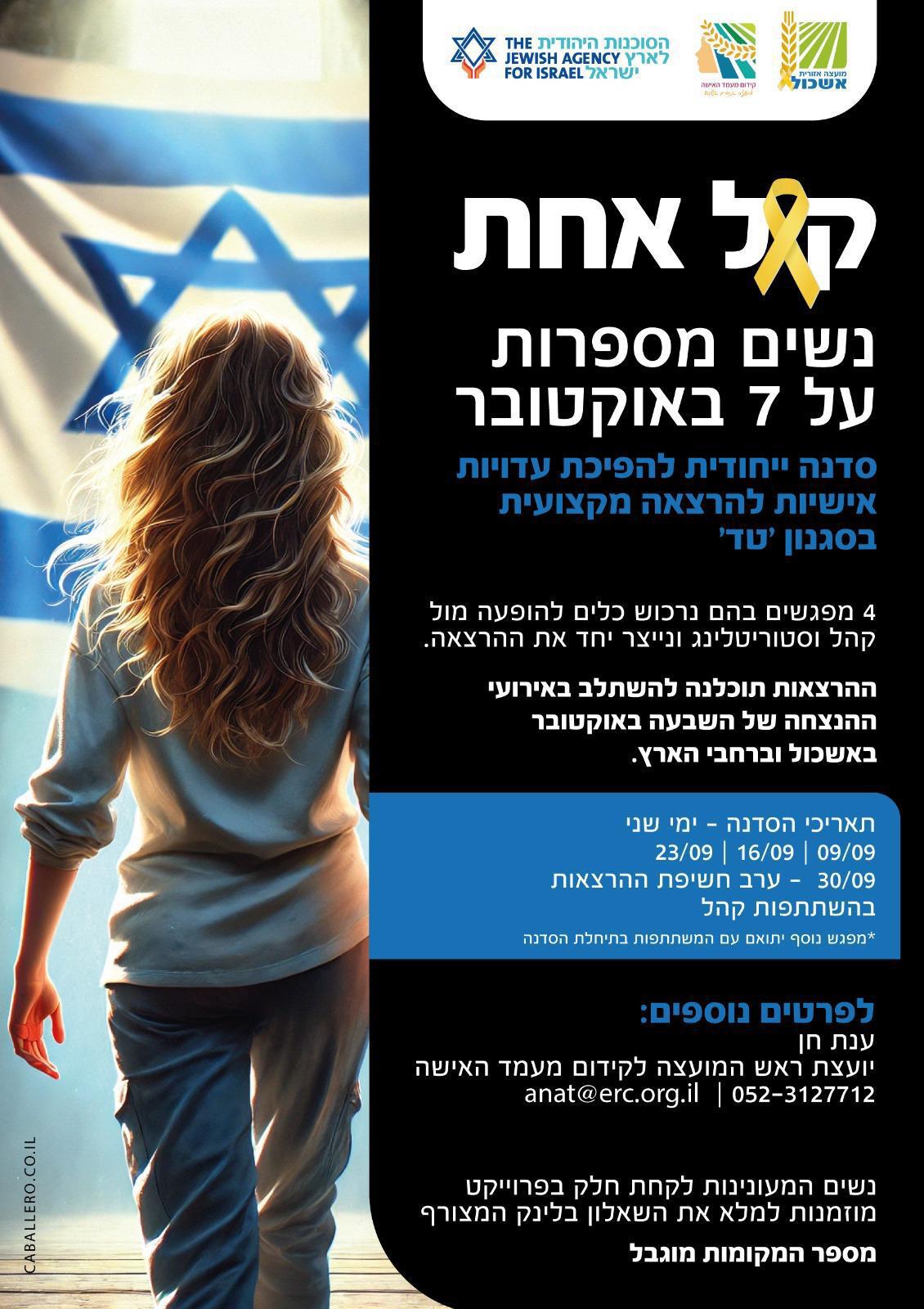 כחלק מכך אנו פותחים סדנה ייחודית לנשים בת 4 מפגשים להפיכת העדויות האישיות להרצאות מקצועיות. הרצאות אשר תוכלנה להשתלב באירועי ההנצחה באשכול וברחבי הארץ.