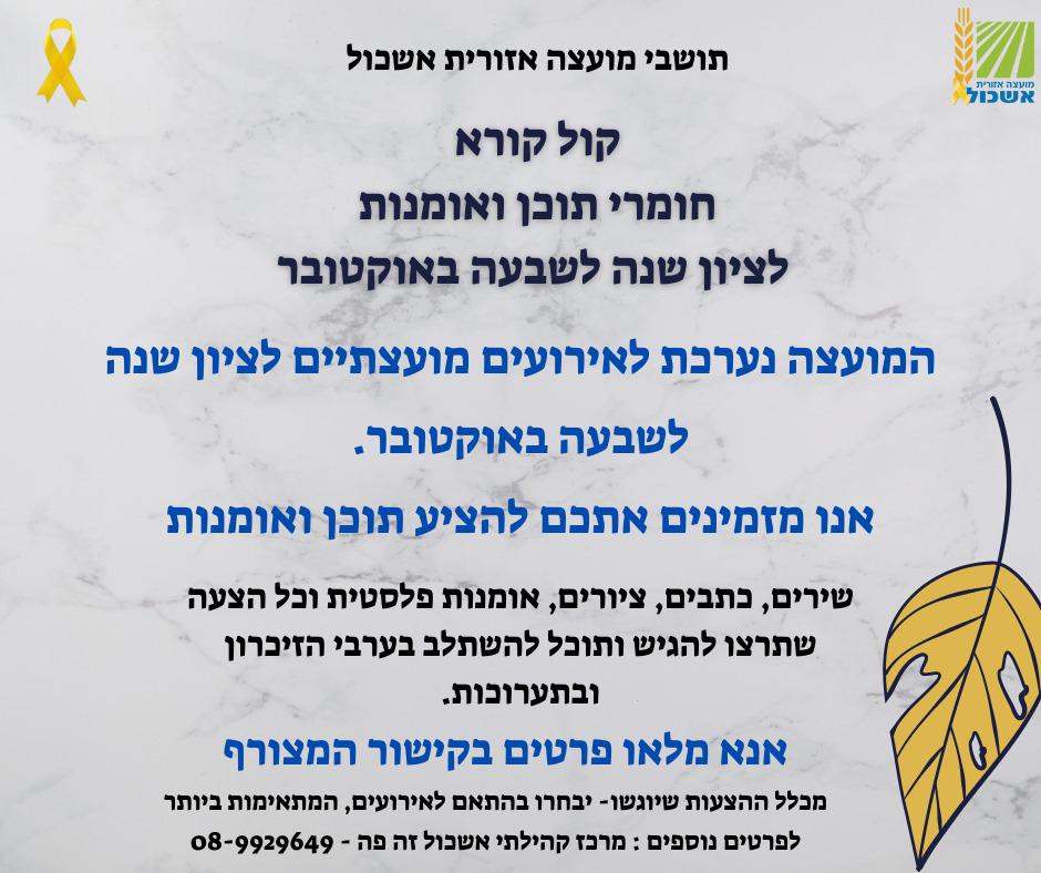אנו מזמינים את תושבות ותושבי המועצה להגיש חומרי תוכן ואמנות, כגון: שירים, כתבים, ציורים אמנות פלסטית וכדומה, אשר יוכלו להשתלב בערבי הזיכרון ובתערוכות.
