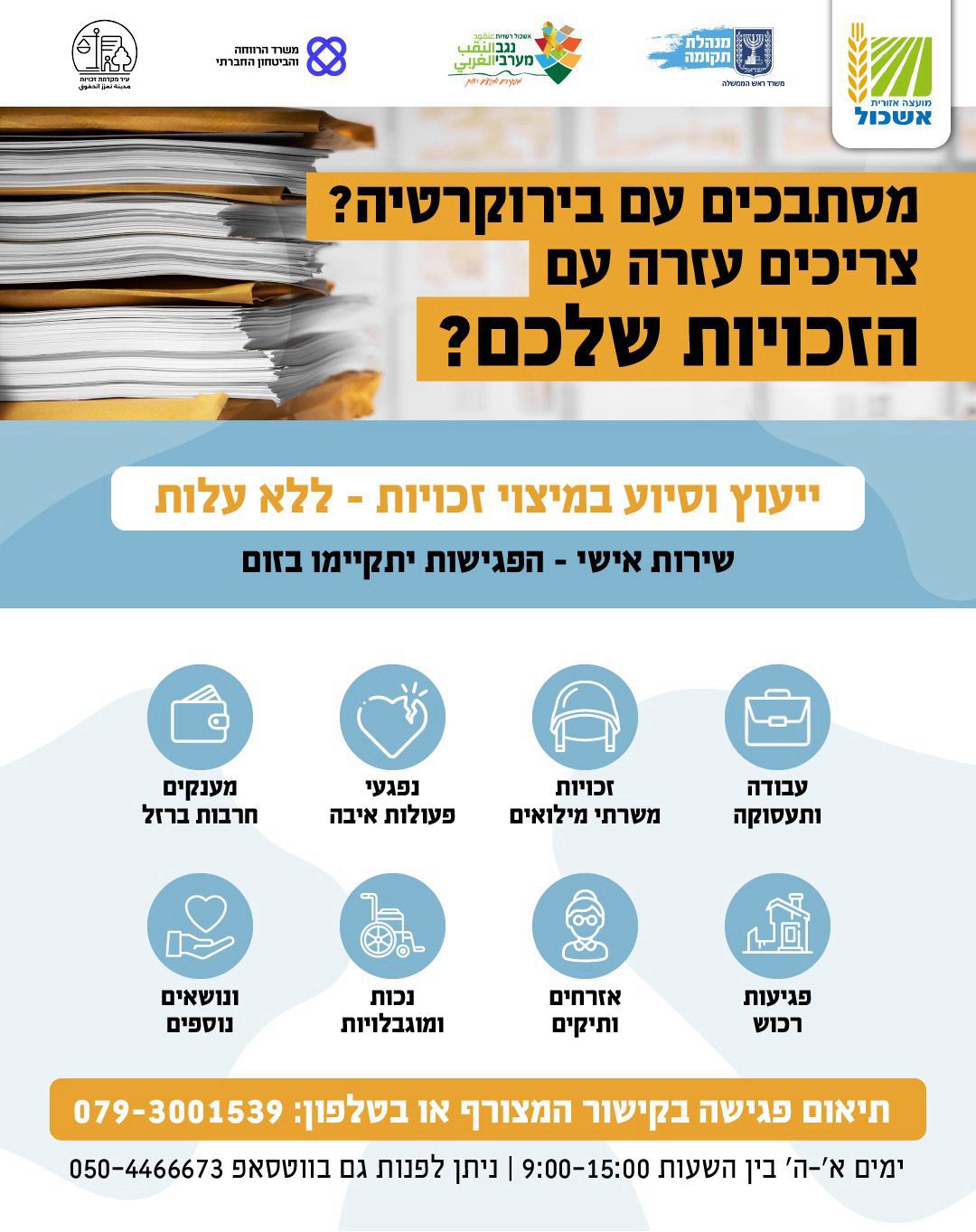 תושבים יקרים, מוזמנים לתאם פגישה אישית בזום לסיוע במיצוי זכויות.