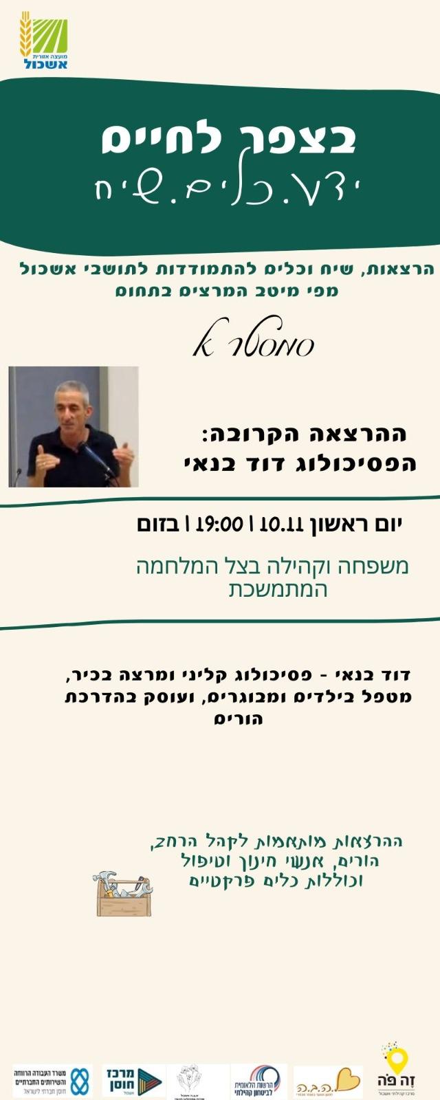 מפגשי הרצאות, שיח ודרכי התמודדות - במיוחד לתושבי אשכול ממיטב המרצים בתחום.