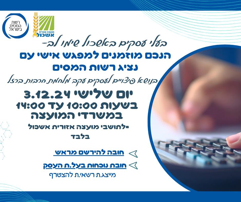 ב3.12.24 בין השעות 10:00 עד 14:00 יגיעו נציגי רשות המסים למשרדי המועצה ויקבלו אתכם, בעלי העסקים והחקלאים ברישום מראש בלבד מכיוון שמס' מקומות מוגבל.