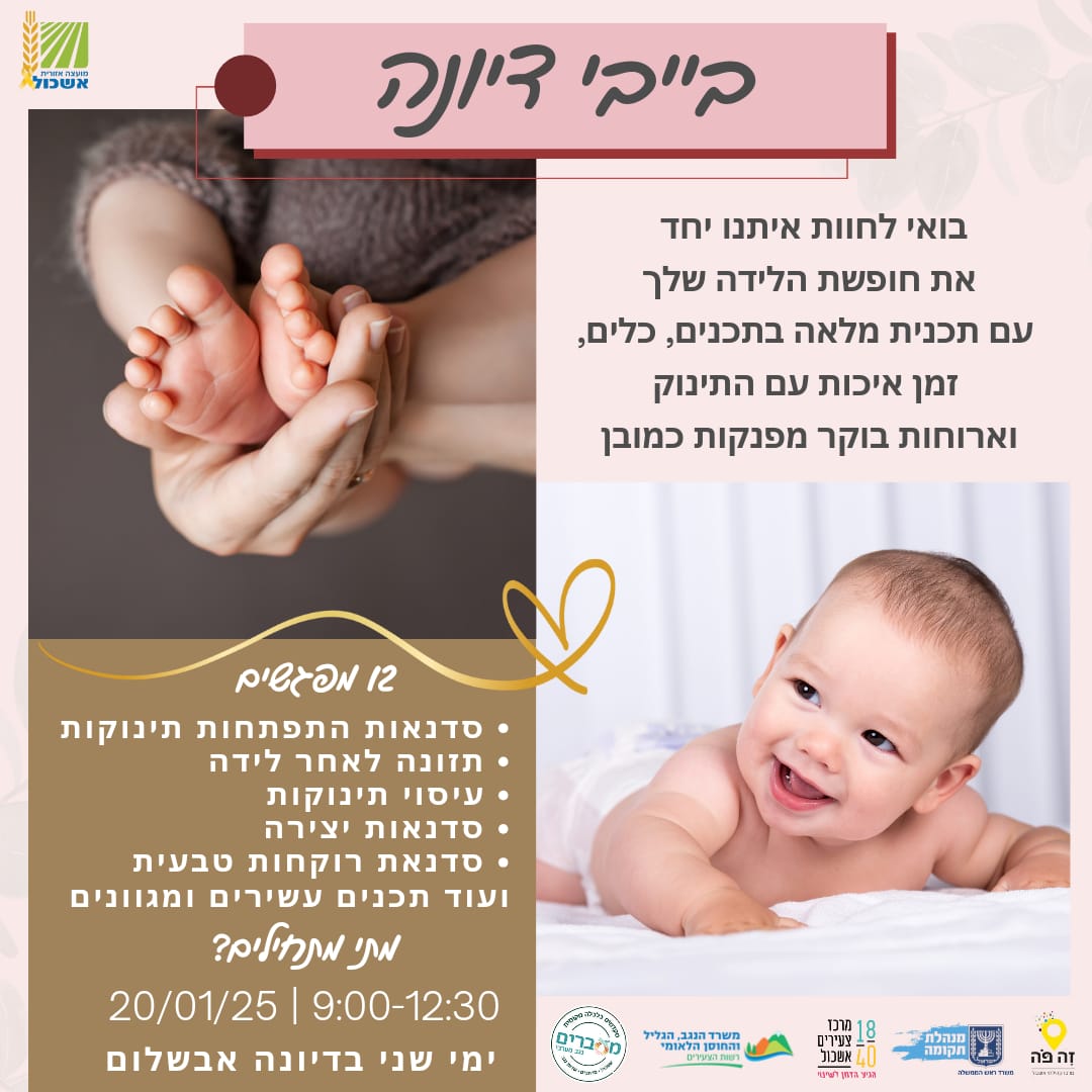 בעלות עסק מתחומים שונים במועצה שיתפו פעולה ובנו במיוחד עבורכן תכנית שווה לחופשת הלידה הכוללת 12 מפגשים שבועיים עם מגוון תכנים מקצועיים ומגוונים לכן ולתינוק שלכן.