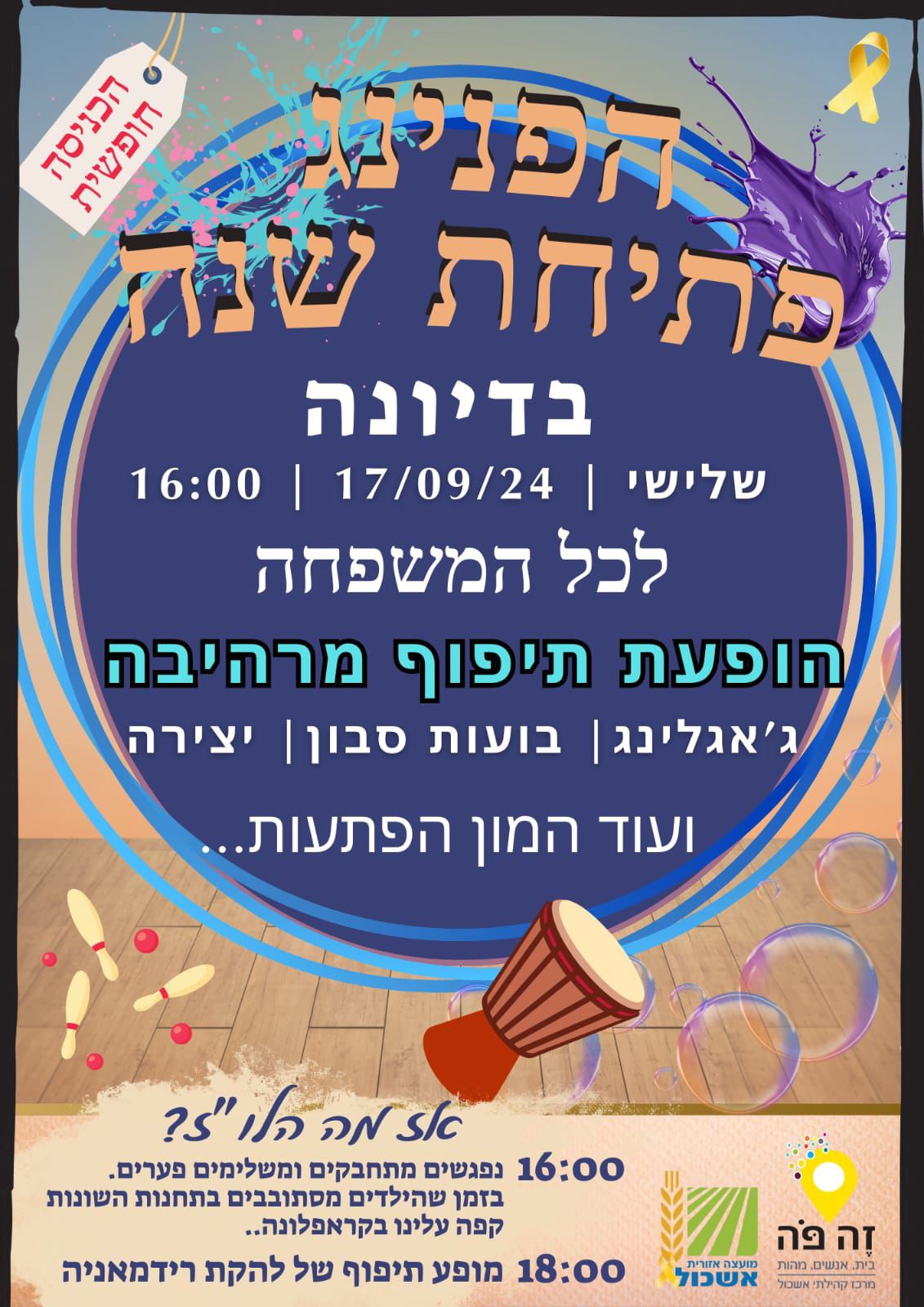 דוכני ג׳אגלינג,בועות סבון,יצירה,קליעת צמות ,ריקודי עם,שעת סיפור ועוד הפתעות…