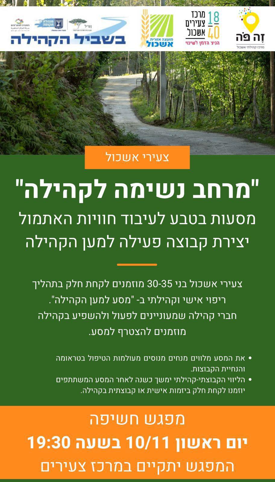 מפגש חשיפה יתקיים ביום ראשון | 10/11 | בשעה: 19:30 | במרכז צעירים אשכול