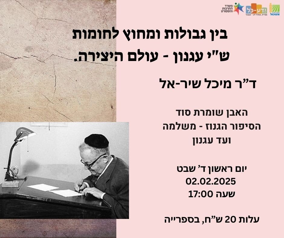 הוסף ללוח שנה 2025-02-02 00:00:00 2025-02-02 01:00:00 Asia/Jerusalem בין גבולות ומחוץ לחומות ש"י עגנון - האבן שומרת סוד למידע מלא: http://www.eshkol.info/events/1206/ ספריית ידע כל