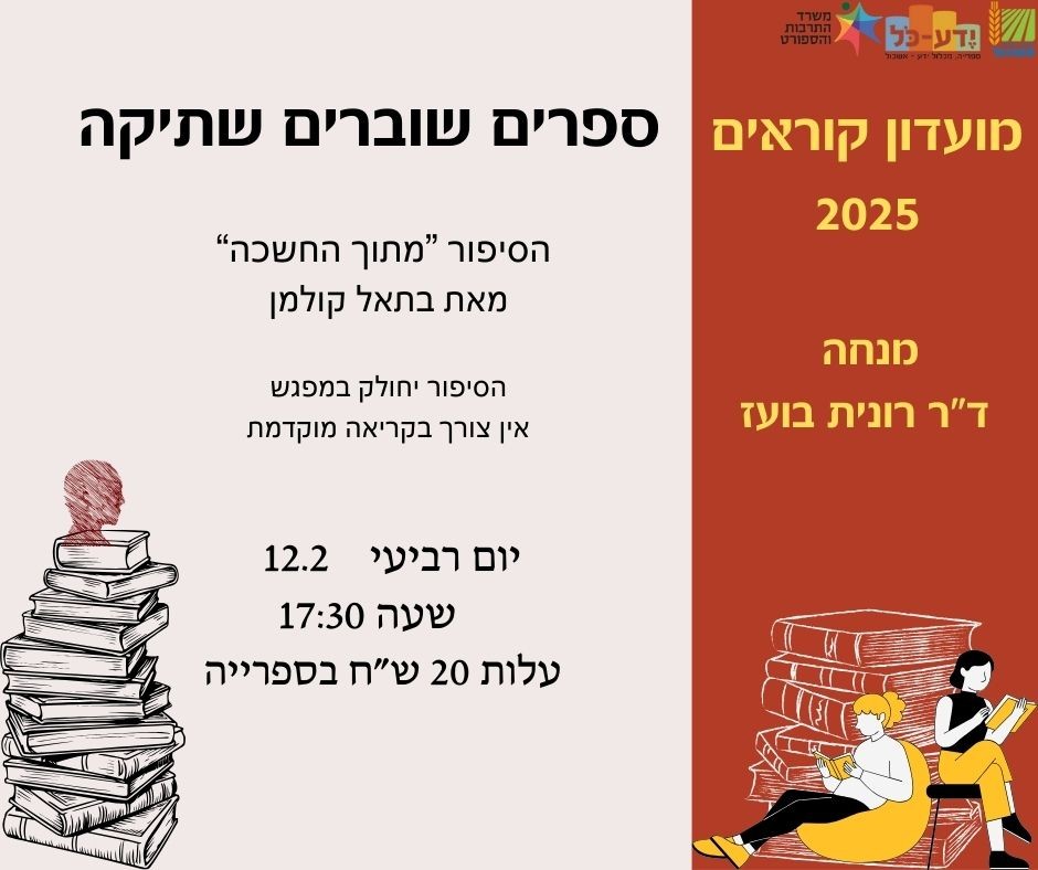 הוסף ללוח שנה 2025-02-12 00:00:00 2025-02-12 01:00:00 Asia/Jerusalem ספרים שוברים שתיקה - הסיפור "מתוך החשכה" מאת בתאל קולמן למידע מלא: http://www.eshkol.info/events/1213/