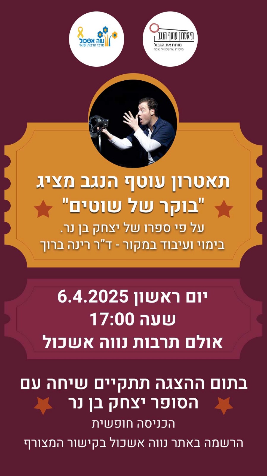 יום ראשון 6.4.25 שעה 17:00 באולם נווה אשכול. כניסה חופשית. בתום ההצגה תתקיים שיחה עם הסופר יצחק בן נר.