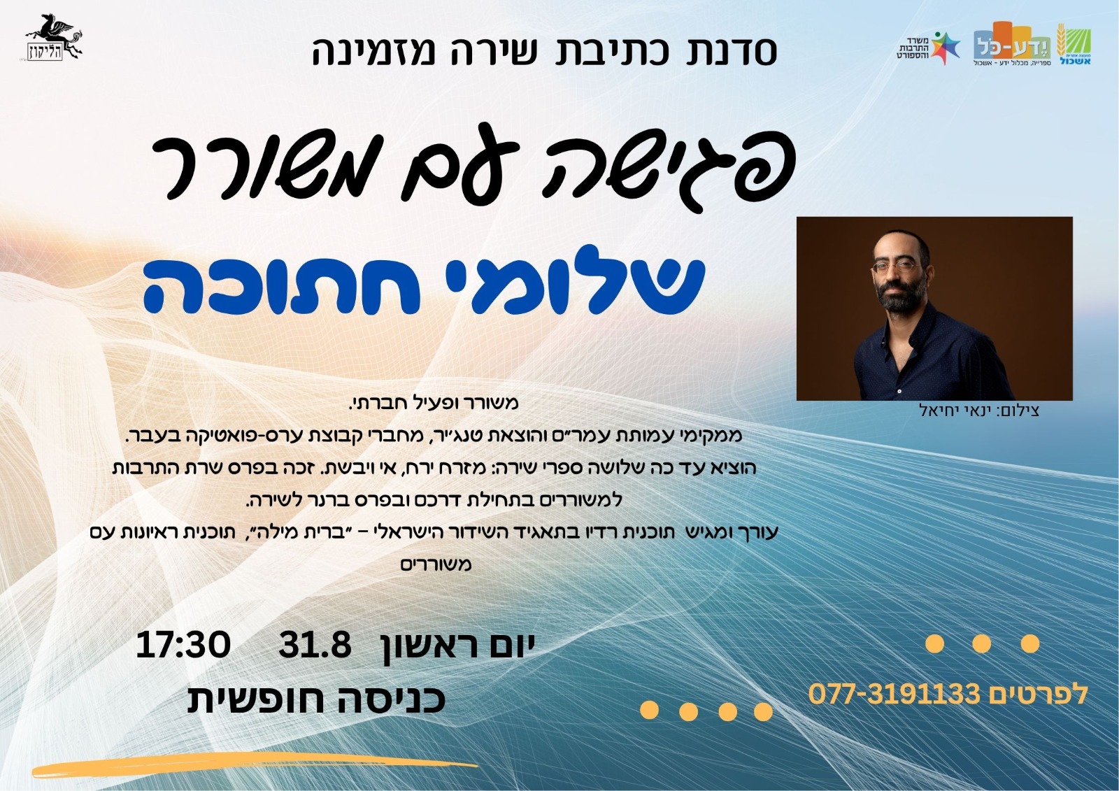 הוסף ללוח שנה 2025-08-31 00:00:00 2025-08-31 01:00:00 Asia/Jerusalem פגישה עם משורר - שלומי חתוכה למידע מלא: http://www.eshkol.info/events/1334/ ספריית ידע כל