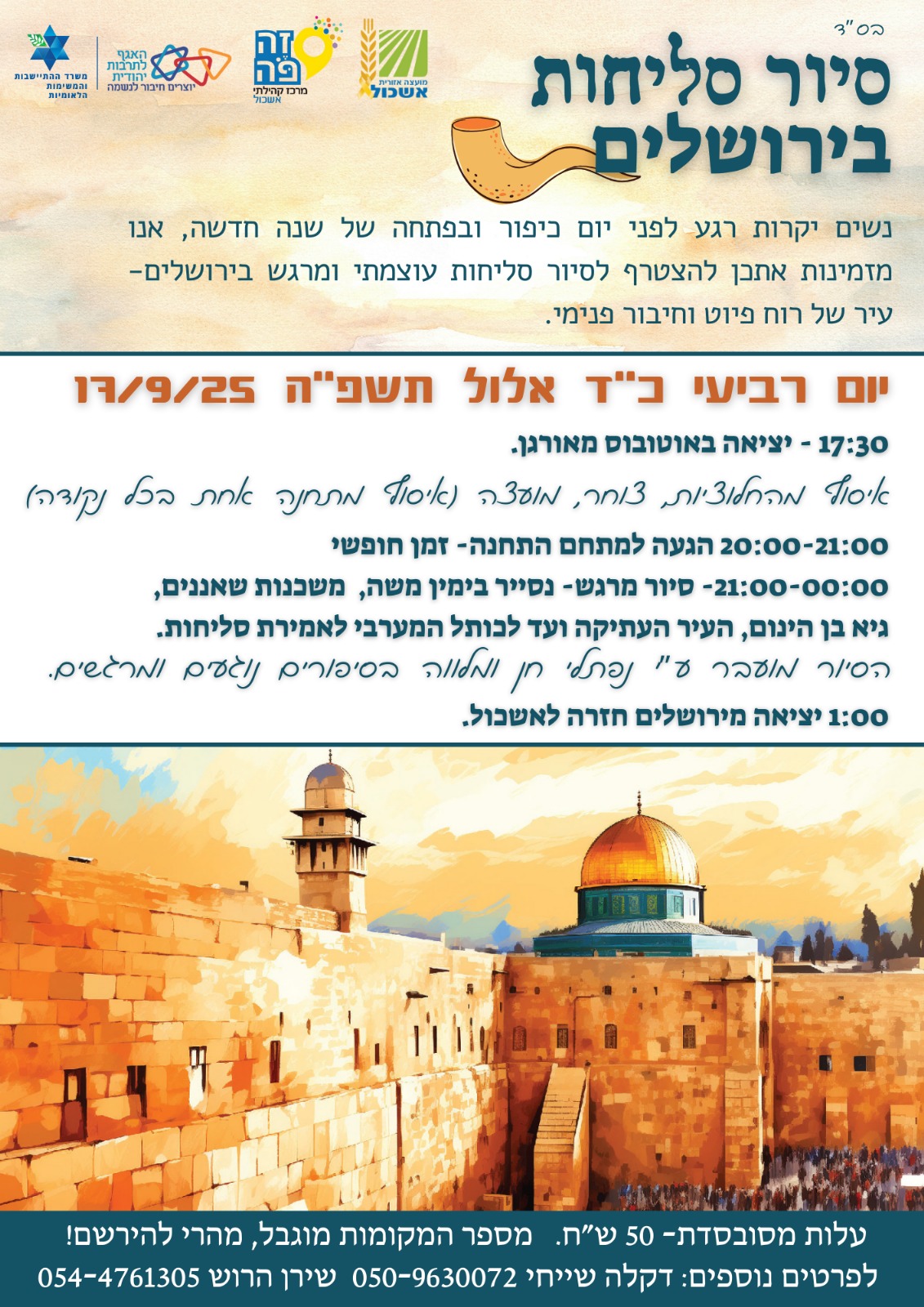 רגע לפני יום כיפור ובפתחה של שנה חדשה, אנו מזמינות אתכן להצטרף לסיור סליחות עוצמתי ומרגש בירושלים – עיר של רוח, פיוט וחיבור פנימי.