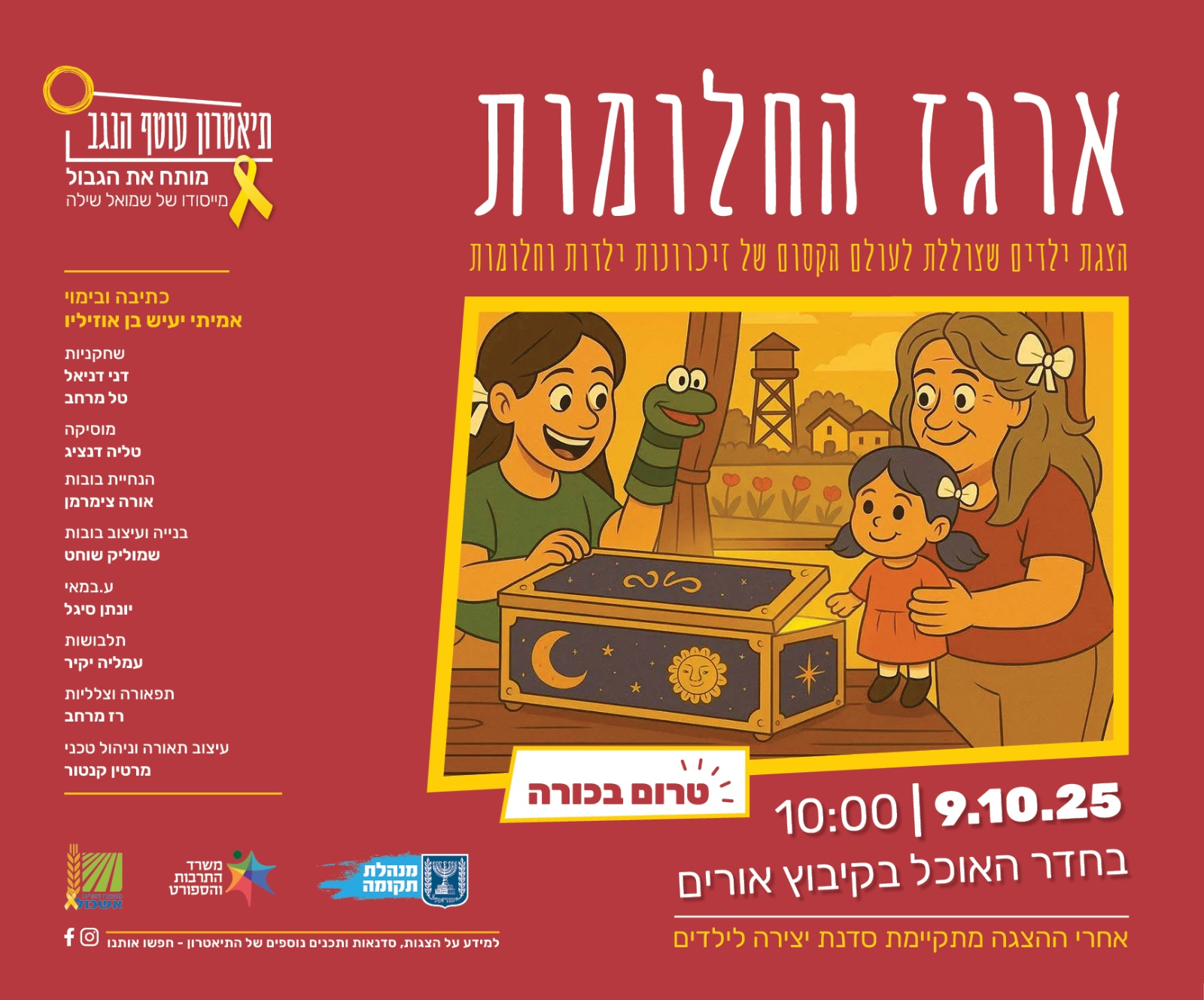 הוסף ללוח שנה 2025-10-09 00:00:00 2025-10-09 01:00:00 Asia/Jerusalem הצגת ילדים חדשה "ארגז החלומות" למידע מלא: https://eshkol.info/events/1351/ חדר אוכל קיבוץ אורים