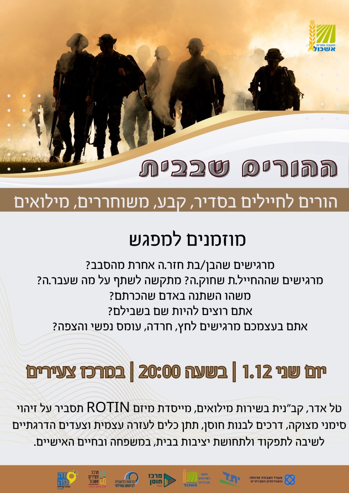 מוזמנים למפגש עם קב"נית בשירות מילואים פעיל כדי ללמוד לזהות סימני מצוקה ולקבל כלים פרקטיים להתמודדות עבורם ועבורכם.