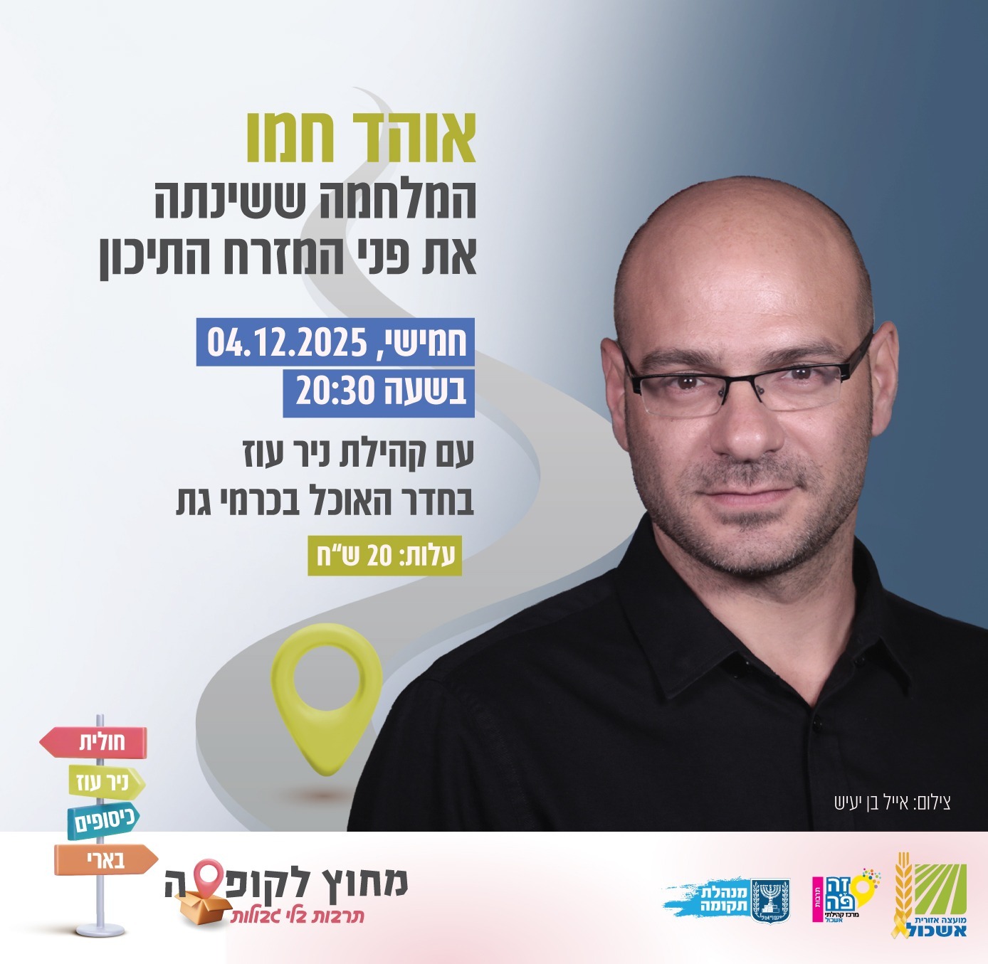 מוזמנים ביום חמישי הקרוב 4.12 בשעה 20:30 אוהד חמו מגיע לקהילת ניר עוז בכרמי גת.