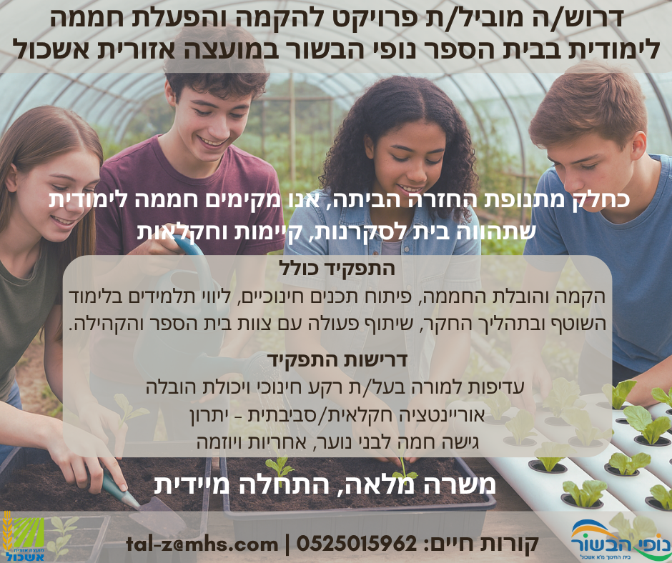 מכרז למשרה: מנהל/ת להקמה והפעלה של חממה לימודית בנופי הבשור