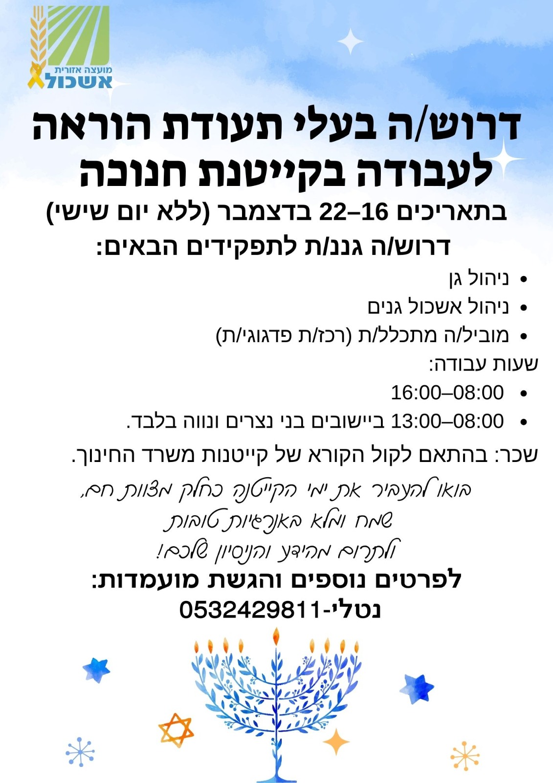 דרוש/ה בעלי תעודת הוראה לעבודה בקייטנת חנוכה