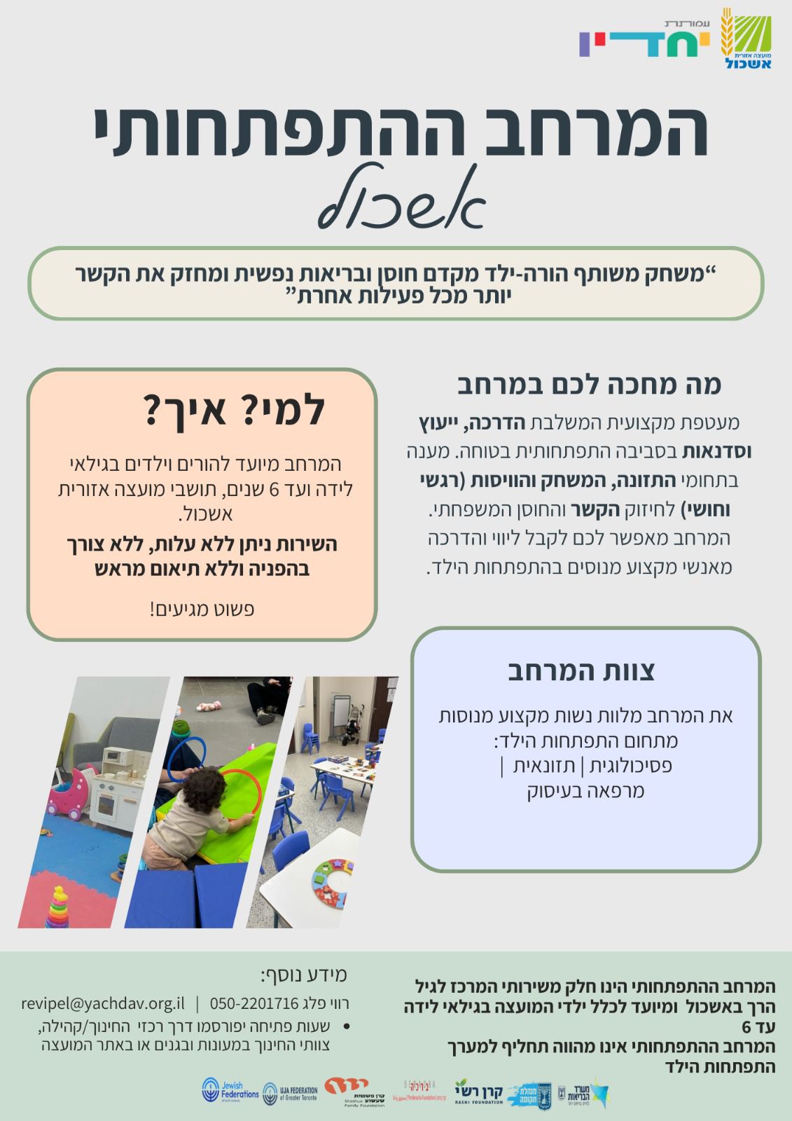 המרחב מיועד להורים וילדים בגילאי לידה ועד 6 שנים, תושבי מועצה אזורית אשכול.
