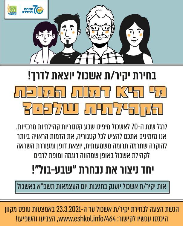 לקראת חגיגות יום העצמאות באשכול, שיעמוד השנה בסימן 70 שנה למועצה, יצאנו בקול קורא להגשת המלצות ליקיר/ת אשכול - אנשי המופת בקהילתנו, שתורמים תרומה משמעותית ויוצאת דופן לחיינו במשך שנים. אשכול שופעת באנשים איכותיים, מרגשים ומעוררי השראה ובשנה מיוחדת זו נעניק את האות ל-7 מהם, ב-7 קטגוריות שונות שמיפינו. מרגע שפרסמנו את קול הקורא לציבור הוגשו כבר עשרות רבות של המלצות.