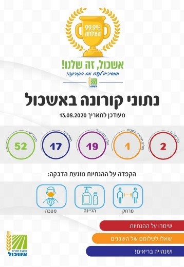אני שמח לעדכן ששני תושבי המועצה שאובחנו מאומתים, החלימו וחזרו לשגרת חייהם: הרב רפי פרץ מהישוב נווה וחברתנו מהישוב עמיעוז. מספר החולים באשכול עומד כעת על 2 בלבד וכולנו תקווה שנצליח להמשיך יחד עם המגמה הירוקה. סיירת הקורונה שלנו ,המורכבת מנוער אשכול, ממשיכה להסתובב ברחבי המועצה לחיזוק ההסברה והשמירה על ההנחיות. חברי הסיירת מחלקים מסיכות, בקבוקי אלכוג'ל ומדבקות הצטיינות למקפידים על ההנחיות. המדבקות שהכנו כבר תיכף נגמרות...מה שמצביע על ההקפדה שלכם על ההנחיות. הרבה תודה לכם על כך. ככל שנמשיך בדרך זו, נרוויח ונקבל סמכויות רבות יותר לניהול שגרת החיים בצל הקורונה.