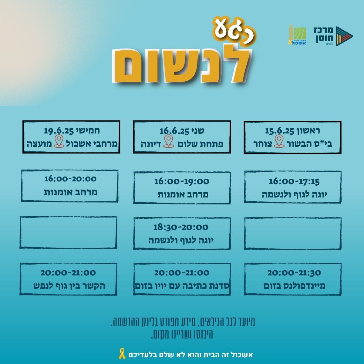 מידע מפורט ומיקום בלינק ההרשמה לפעילות. הרשמו ושריינו לכם מקום.