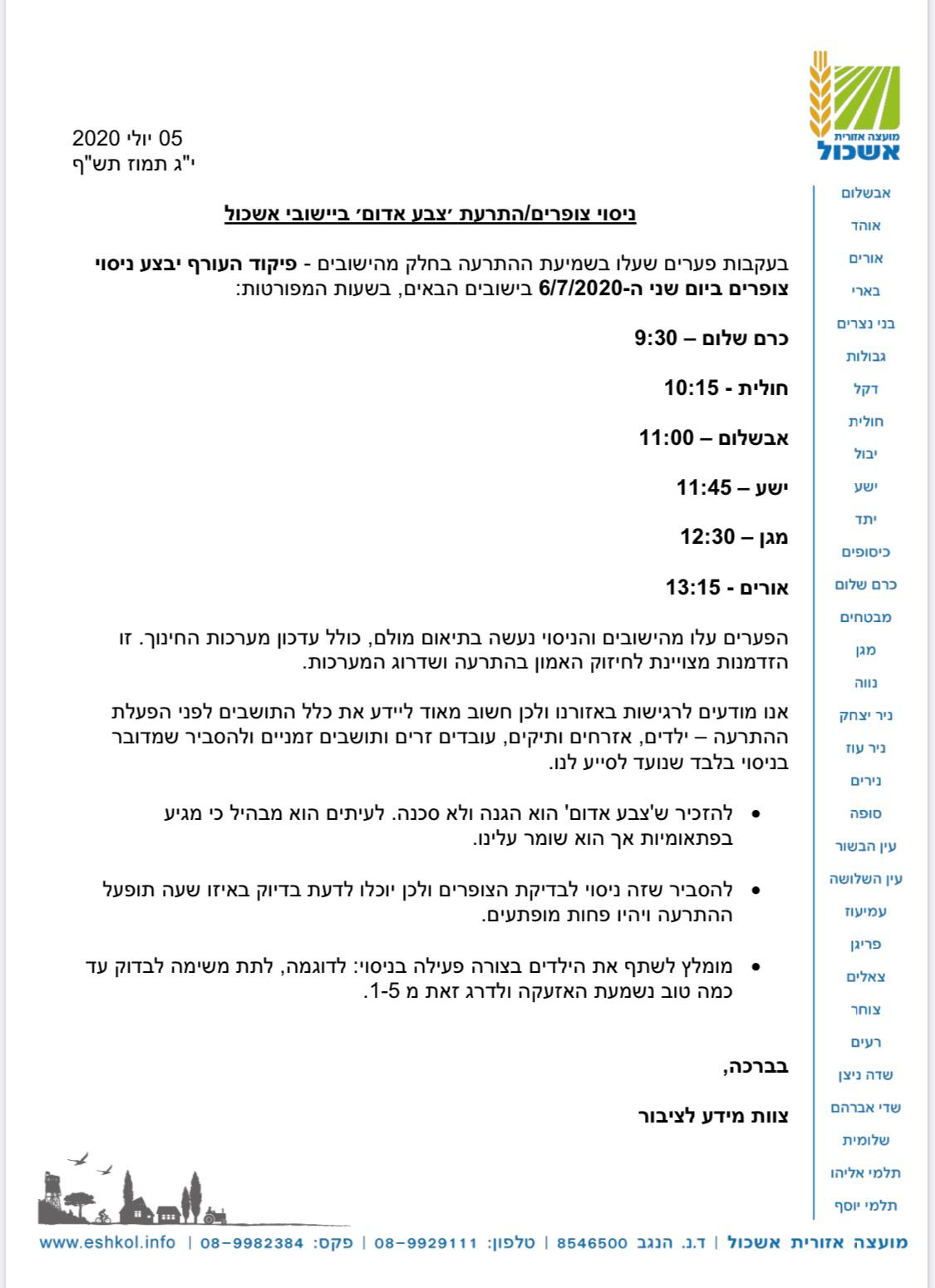 הניסוי בעקבות פערים שעלו בשמיעת ההתרעה בישובים אלה. השעות המפורטות במסמך המצורף