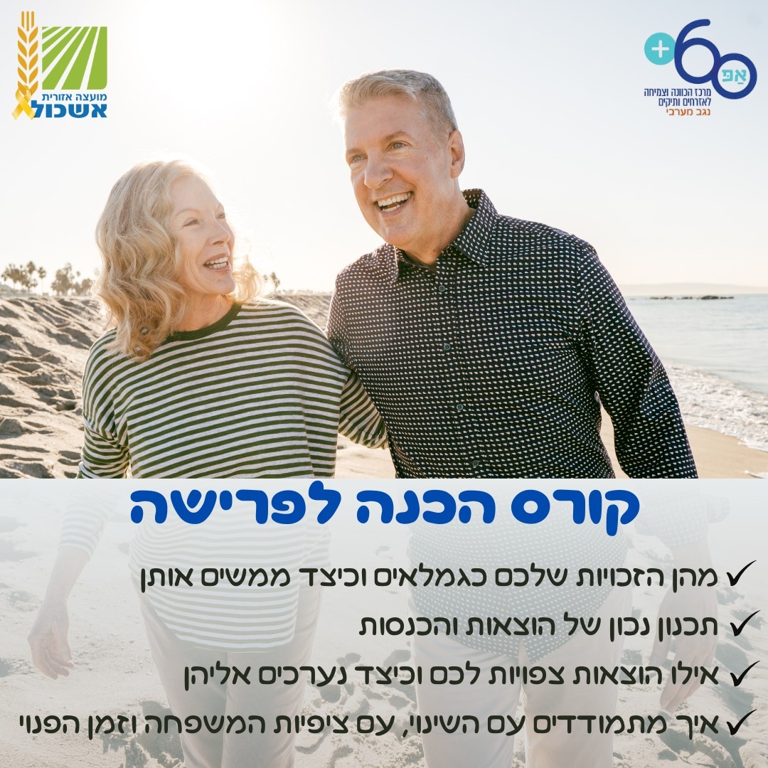 מועצה אזורית אשכול בשיתוף פעולה עם אפ 60+ מביאים עד אליכם סדנת הכנה כלכלית לפרישה מהעבודה.