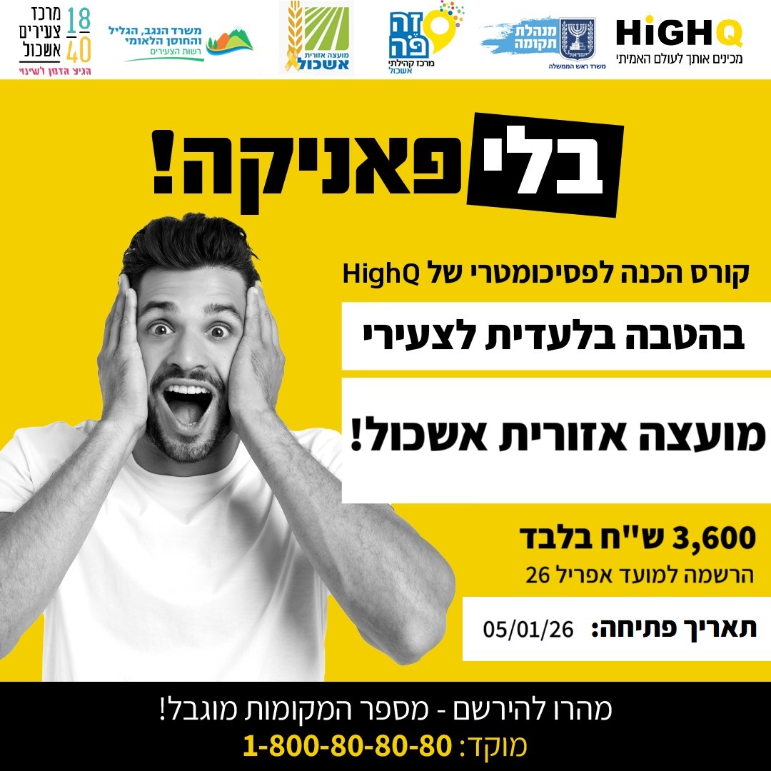 ב־מרכז צעירים אשכול, בשיתוף HighQ, מחכה לך קורס פסיכומטרי בהטבה בלעדית לצעירי האזור!