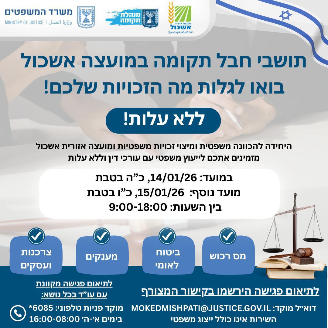 לאור הביקוש, הוספנו ימי קבלת קהל נוספים במועצה עם נציגי משרד המשפטים לסיוע בנושא תביעות פגיעות הדף וצרכים נוספים של מיצוי זכויות.