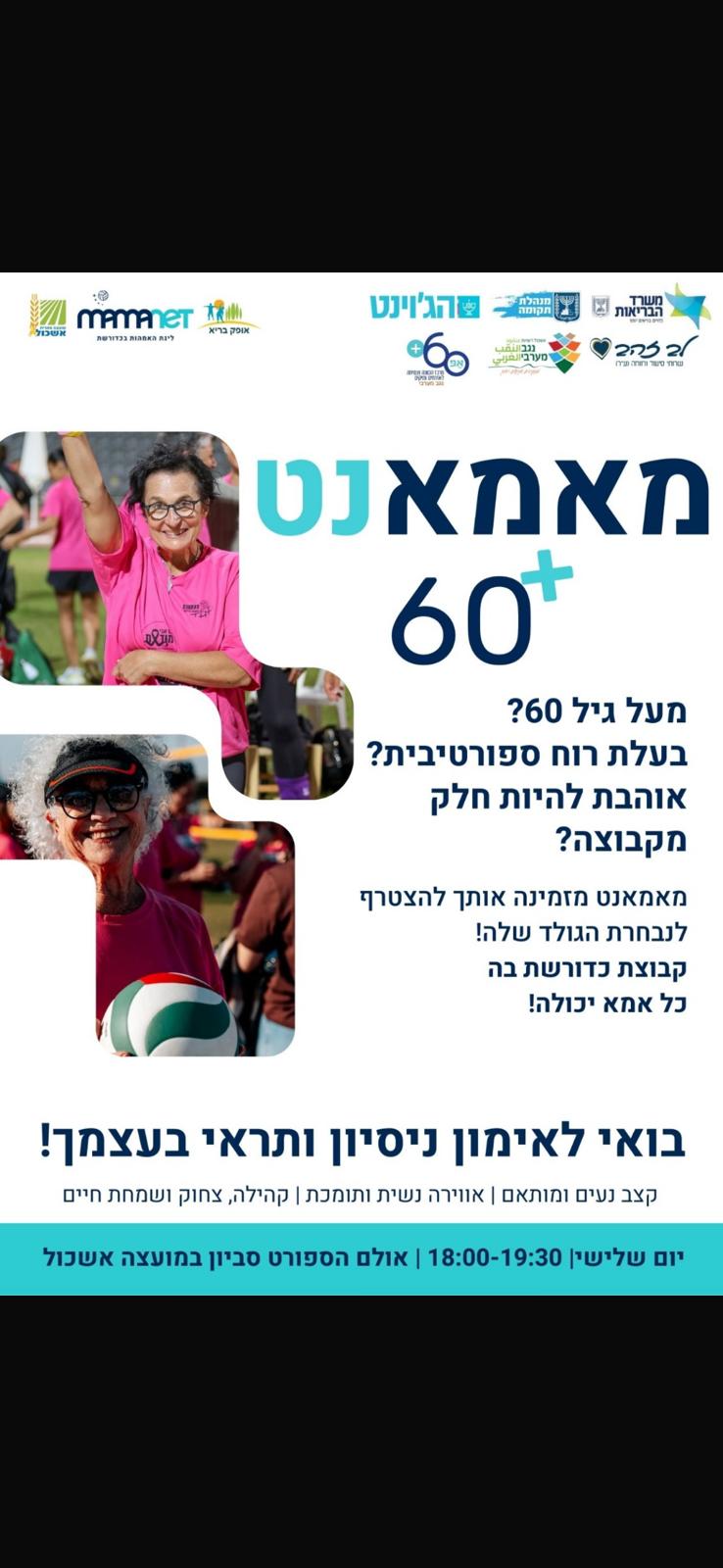 נשים 60+ ״אופק בריא״ מזמינה אתכן לקחת חלק במשחק קבוצתי וחווייתי !מוזמנות להגיע לאימון הפתיחה שיערך בתאריך 27.1 בשעה 18:00 באולם סביון (מתחם המועצה)
