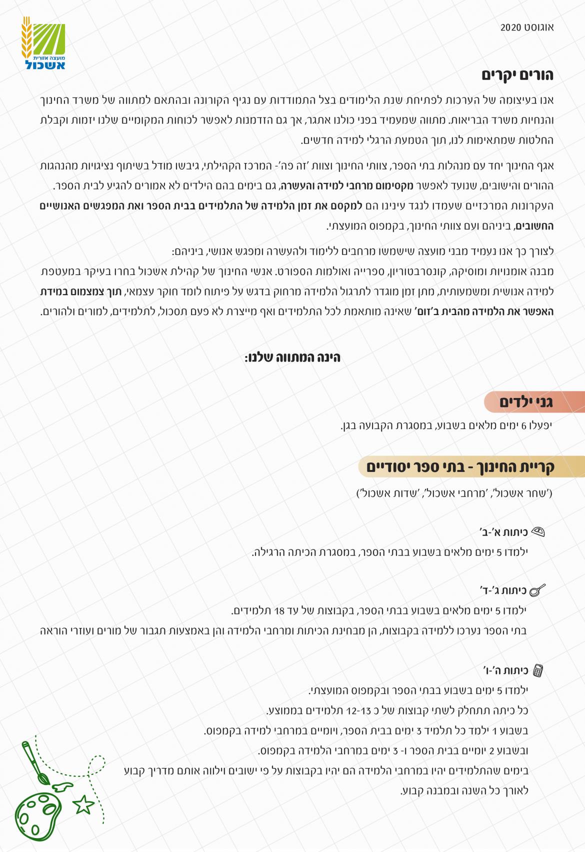 מתווה שנת הלימודים תשפ"א - אשכול