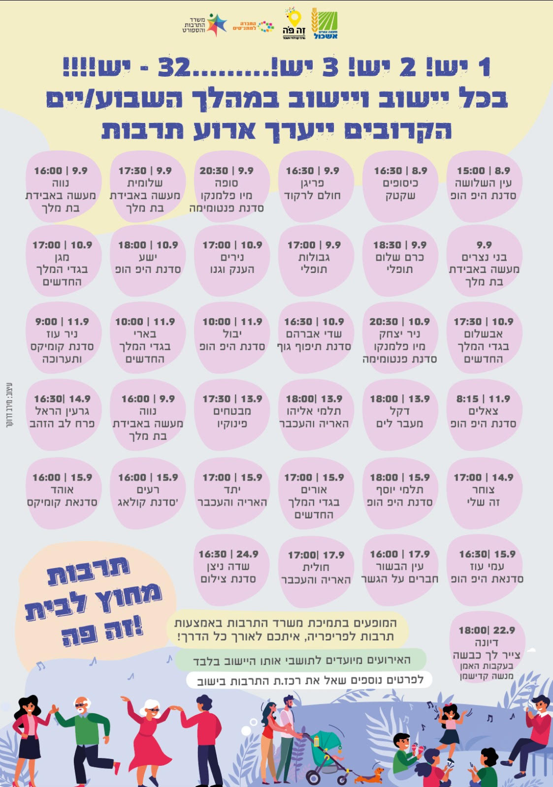 אנחנו מתרגשים. במהלך השבועיים הקרובים יתקיים בכל אחד מ-32 יישובי המועצה אירוע תרבות, במימון משרד התרבות והספורט.