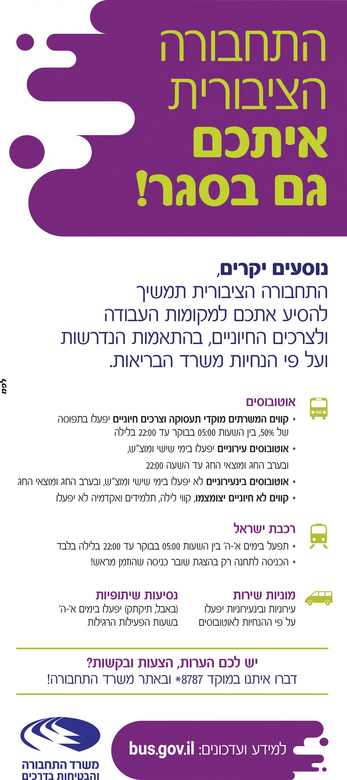 בימים ראשון – חמישי, תסתיים פעילות התחבורה הציבורית היומית בשעה 22:00 (הנסיעות האחרונות שיבוצעו הן אלו שיצאו בשעה 22:00).