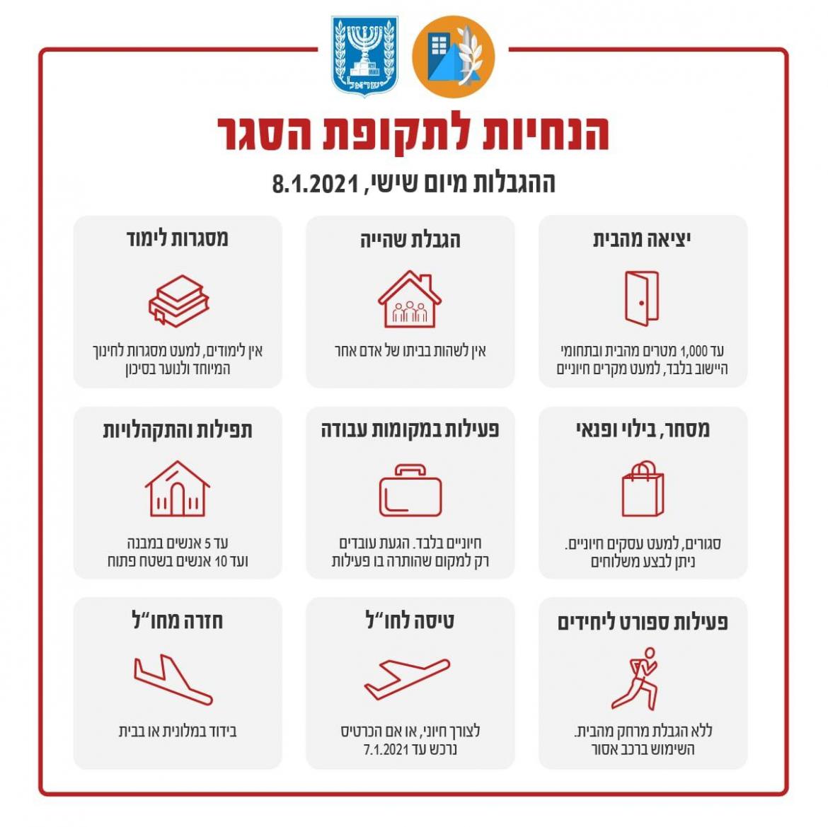 הלילה בחצות תכנסנה לתוקף מגבלות להידוק הסגר שתמשכנה 14 יום לפחות, עד ל-21.1. להלן עיקרי ההנחיות: