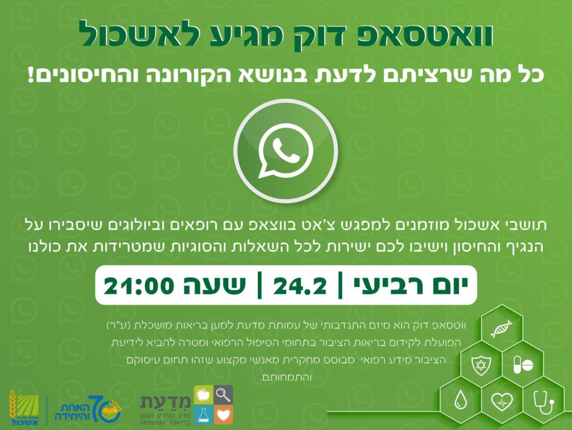 תושבי אשכול מוזמנים למפגש צ'אט בווצאפ עם רופאים וביולוגים שיסבירו על הנגיף והחיסון וישיבו לשאלות ולסוגיות שמטרידות את כולנו.
