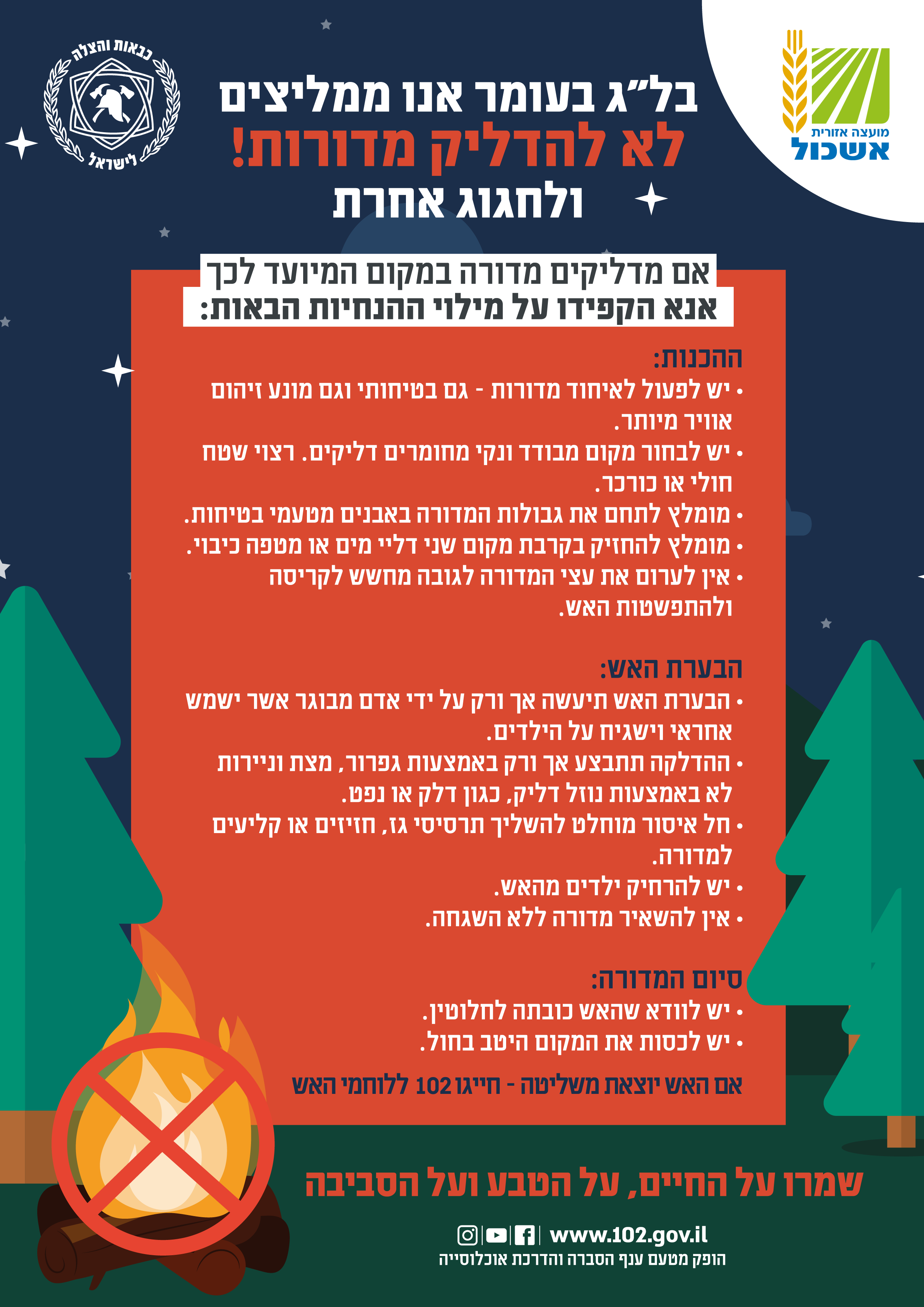 על פי צו נציבות כבאות והצלה לא חל איסור על הדלקת מדורות באזורנו. אך חשוב לנו להזכיר שאפשר לחגוג את החג באופן משמעותי וכייפי, עם פחות נזק לסביבה