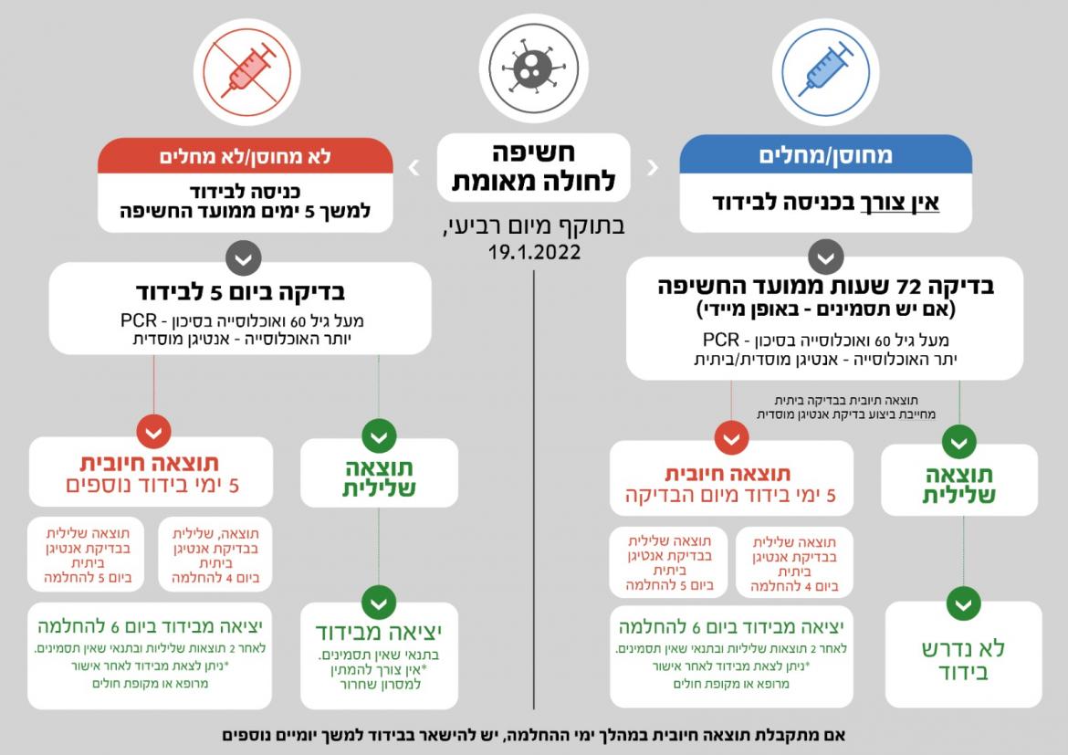 * שימו לב: חולה מאומת שלא ביצע בדיקות או שלא קיבל את התוצאות, ייצא מהביקור ביום ה-7 להחלמה, בתנאי שאין תסמינים ב-48 השעות האחרונות ובכפוף לאישור מרופא או מקופת החולים. בנוסף, אם מתקבלת תוצאה חיובית במהלך ימי ההחלמה, יש להישאר בבידוד למשך יומיים נוספים.