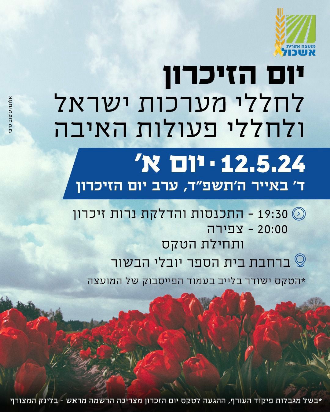 השנה נקיים לראשונה טקס מרכזי מועצתי בו נתייחד עם זכרם של כל חללי אשכול, ביניהם גם חללי השבעה באוקטובר ומלחמת חרבות ברזל - בנותינו, בנינו, בני-משפחותינו וחברינו.