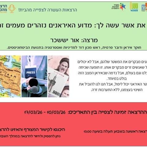 03 מרץהרצאות מהכורסא - איזור הדמדומים: יחסי אהבה-שנאה בין איראן למדינות ערב, ובניית רשת הפרוקסי בלבנון, עזה והאיזורזום -