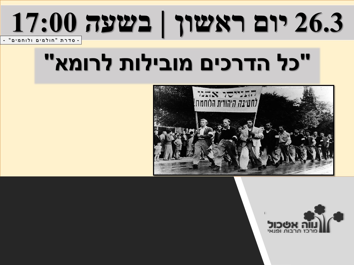 הוסף ללוח שנה 2023-03-26 00:00:00 2023-03-26 01:00:00 Asia/Jerusalem כל הדרכים מובילות לרומא/חזי פוזננסקי למידע מלא: https://eshkol.info/events/1001/ נווה אשכול