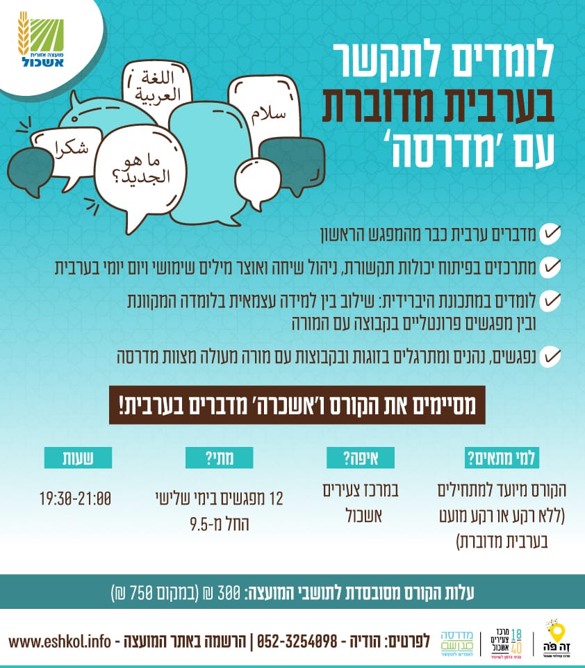הוסף ללוח שנה 2023-05-09 00:00:00 2023-05-09 01:00:00 Asia/Jerusalem לומדים לתקשר בערבית מדוברת עם 'מדרסה' למידע מלא: https://eshkol.info/events/1018/ מרכז צעירים אשכול