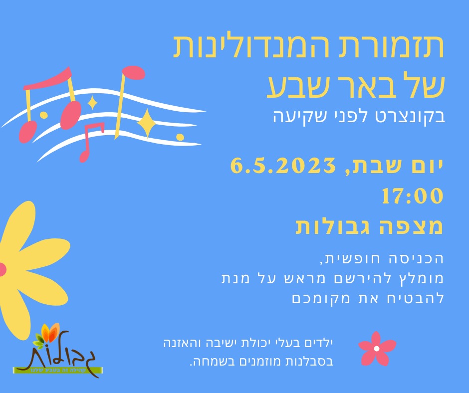 מוזמנים להצטרף לאחר הצהריים מוזיקלי במצפה גבולות עם תזמורת המנדולינות של באר שבע בה מנגנת אחת משלנו- מיכל צביאלי!!