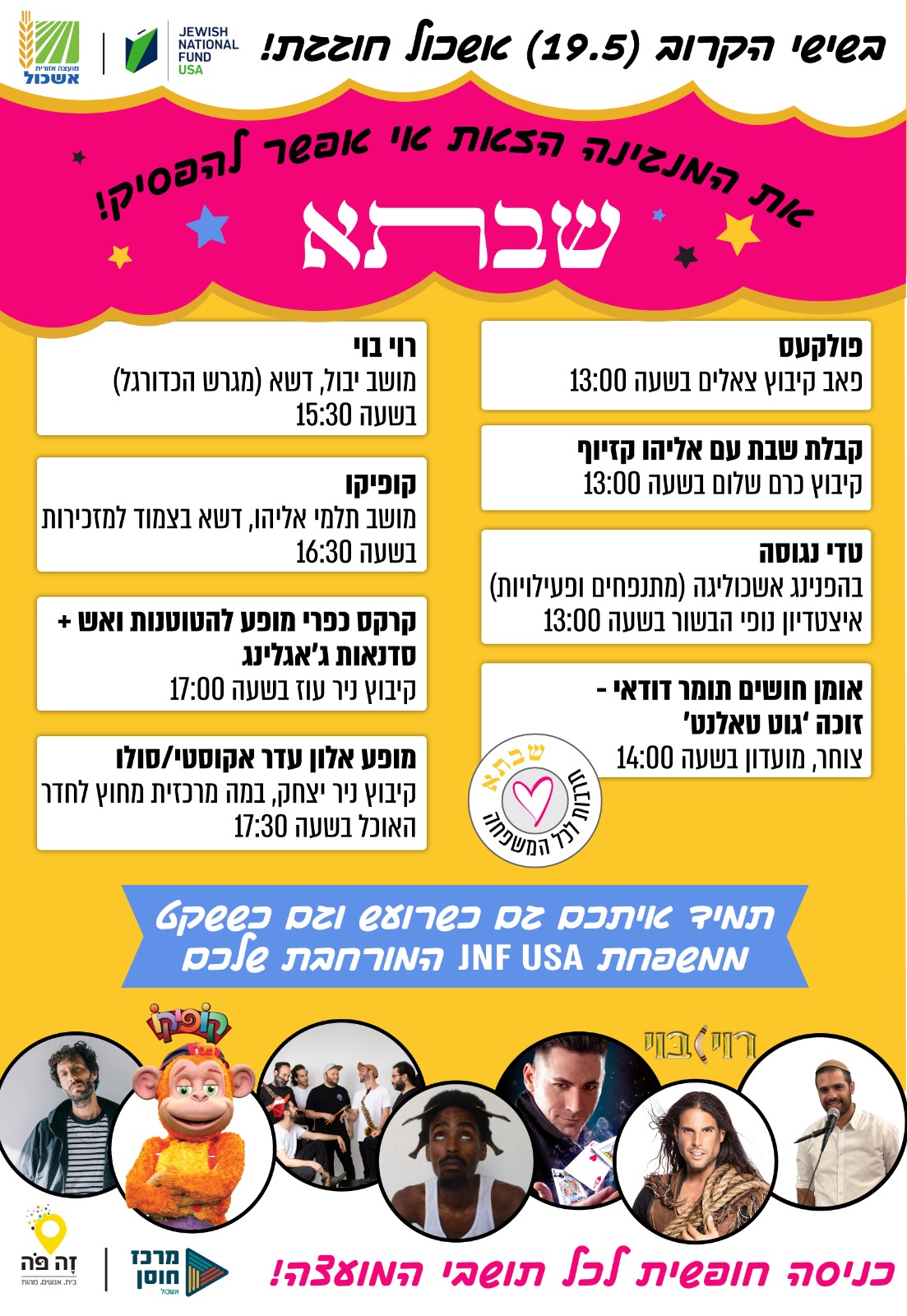 תבחרו מהתוכניה כל מה שיגרום ללב להתרחב כי הכל פתוח לכולם וללא עלות.