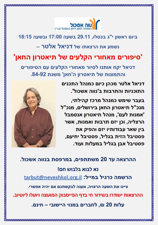 הוסף ללוח שנה 2020-11-29 00:00:00 2020-11-29 01:00:00 Asia/Jerusalem סיפורים מאחורי הקלעים של תיאטרון החאן עם דניאל אלטר למידע מלא: https://eshkol.info/events/107/ דף הפייסבוק של המועצה