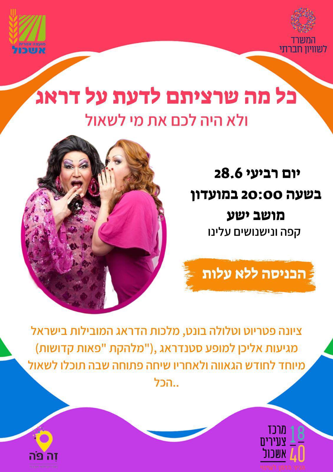 ציונה פטריוט וטלולה בונט (מלהקת "פאות קדושות") מלכות הדראג המובילות בישראל מגיעות אליכן למופע סטנדראג מיוחד לחודש הגאווה ולאחריו שיחה פתוחה שבה תוכלו לשאול הכל!