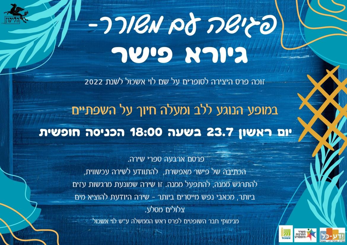 הוסף ללוח שנה 2023-07-23 00:00:00 2023-07-23 01:00:00 Asia/Jerusalem פגישה עם משורר – גיורא פישר למידע מלא: https://eshkol.info/events/1101/ ספריית ידע כל
