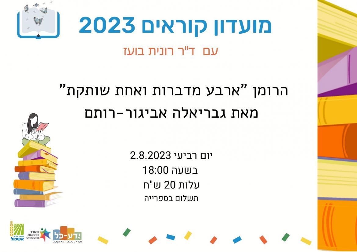 הוסף ללוח שנה 2023-08-02 00:00:00 2023-08-02 01:00:00 Asia/Jerusalem מועדון קוראים - ארבע מדברות ואחת שותקת למידע מלא: https://eshkol.info/events/1109/ ספריית ידע כל