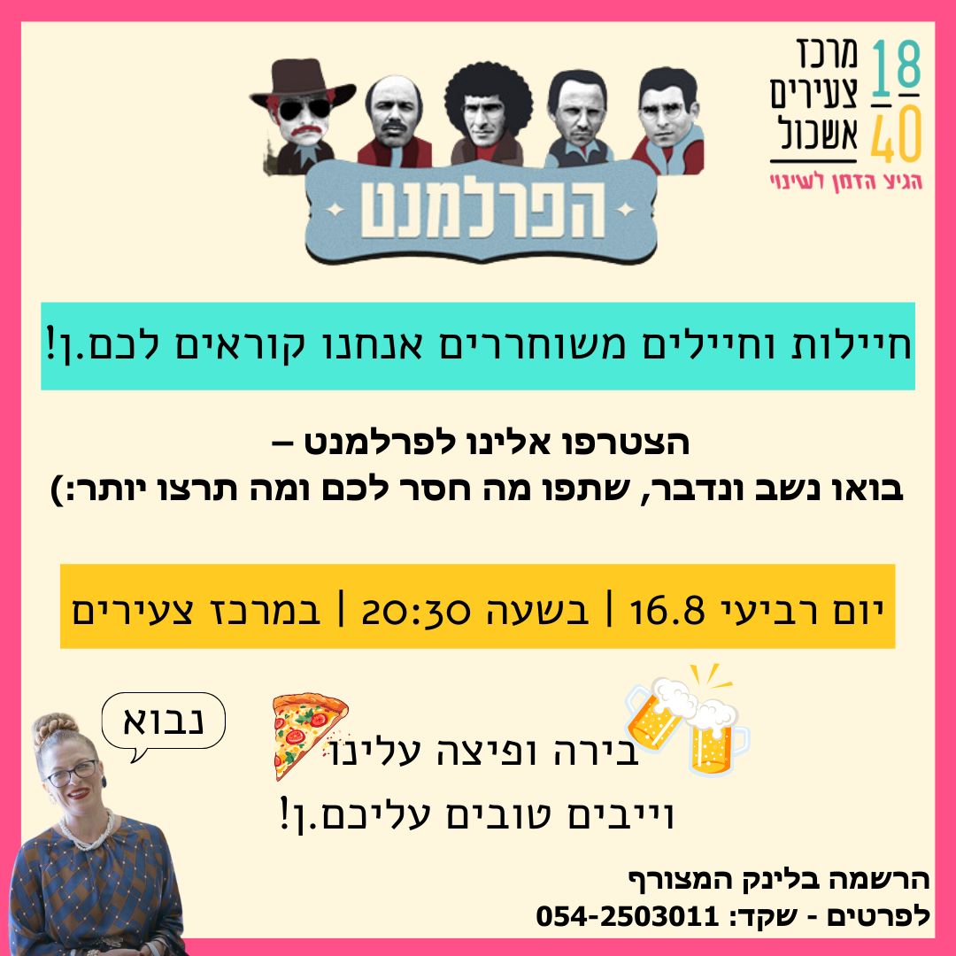 הוסף ללוח שנה 2023-08-16 00:00:00 2023-08-16 01:00:00 Asia/Jerusalem הפרלמנט לחיילים וחיילות משוחררים למידע מלא: https://eshkol.info/events/1115/ מרכז צעירים